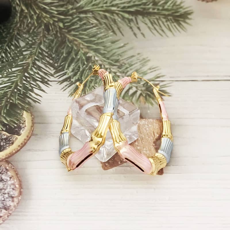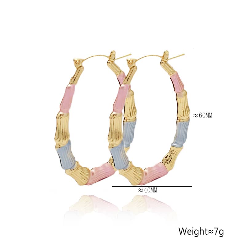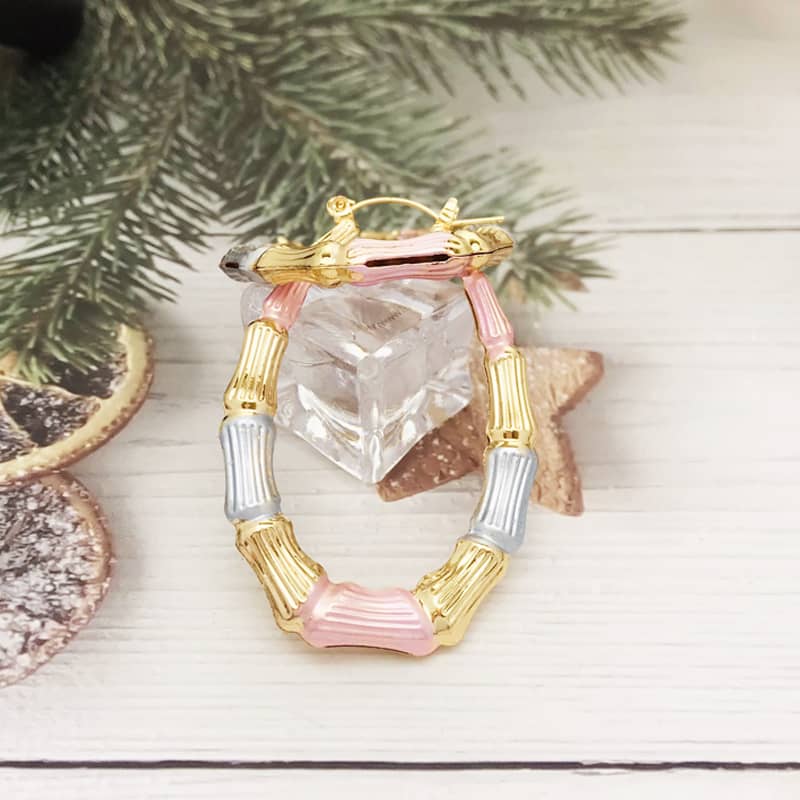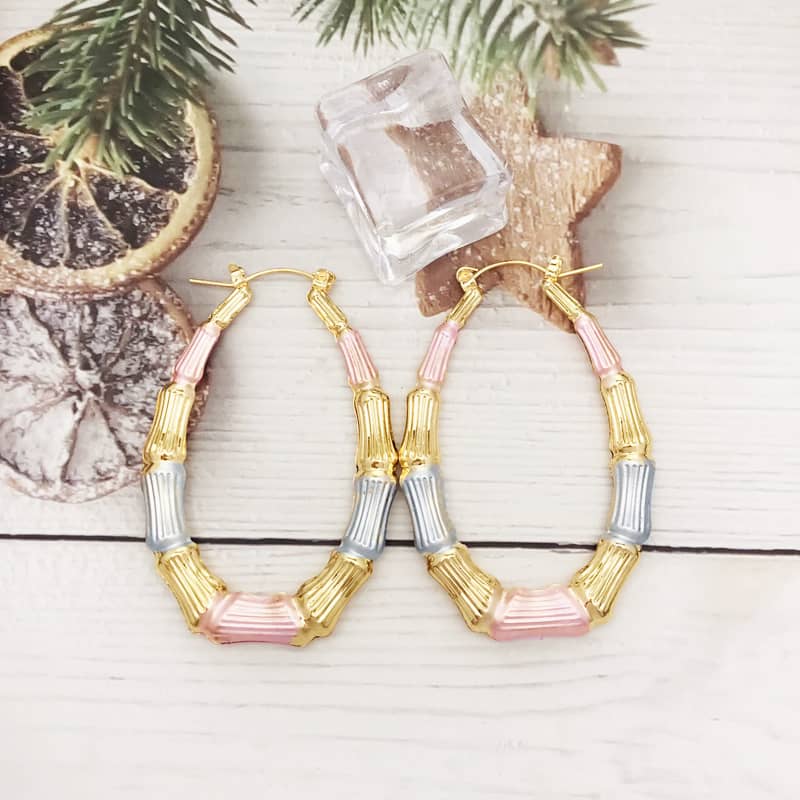 18k Layered Real Gold Filled oval bamboo hoop earrings tri colors #68