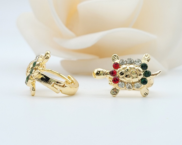 These 18k layered real gold plated turtle huggies earrings feature round cubic zirconia stones in various colors, set in yellow gold filled metal with a pavé style. The earrings have a hook closure and are designed in a huggie style, perfect for adding a touch of anime-inspired flair to any outfit. Made in China, these earrings are crafted with excellent cut grade and are sure to make a stylish statement with their unique and eye-catching design.