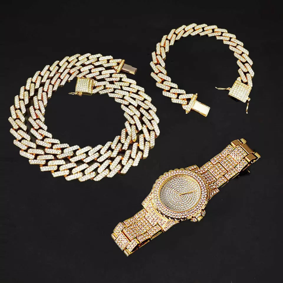 Hip hop set icedout necklace bracelet watch gold Plated #209