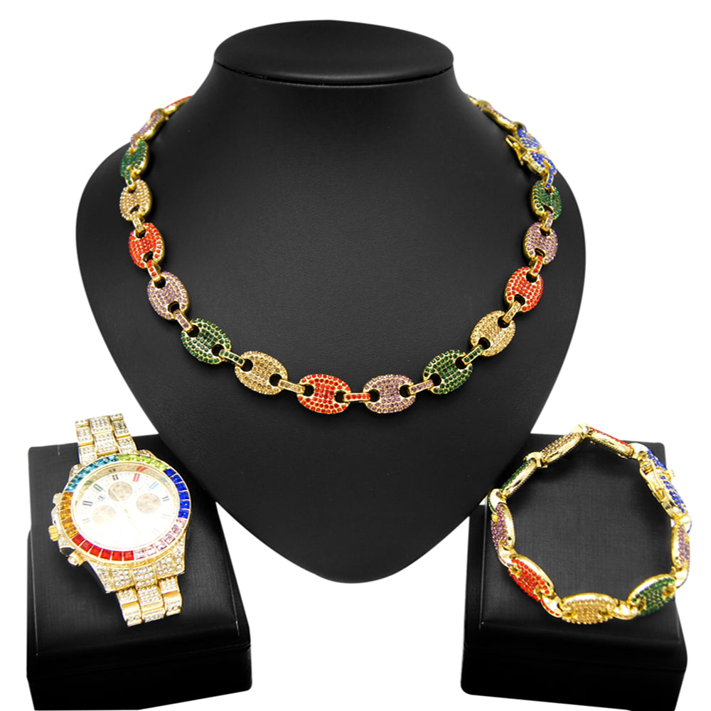 Hip hop set icedout puff mariner necklace bracelet colors stones watch gold Plated #208