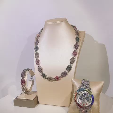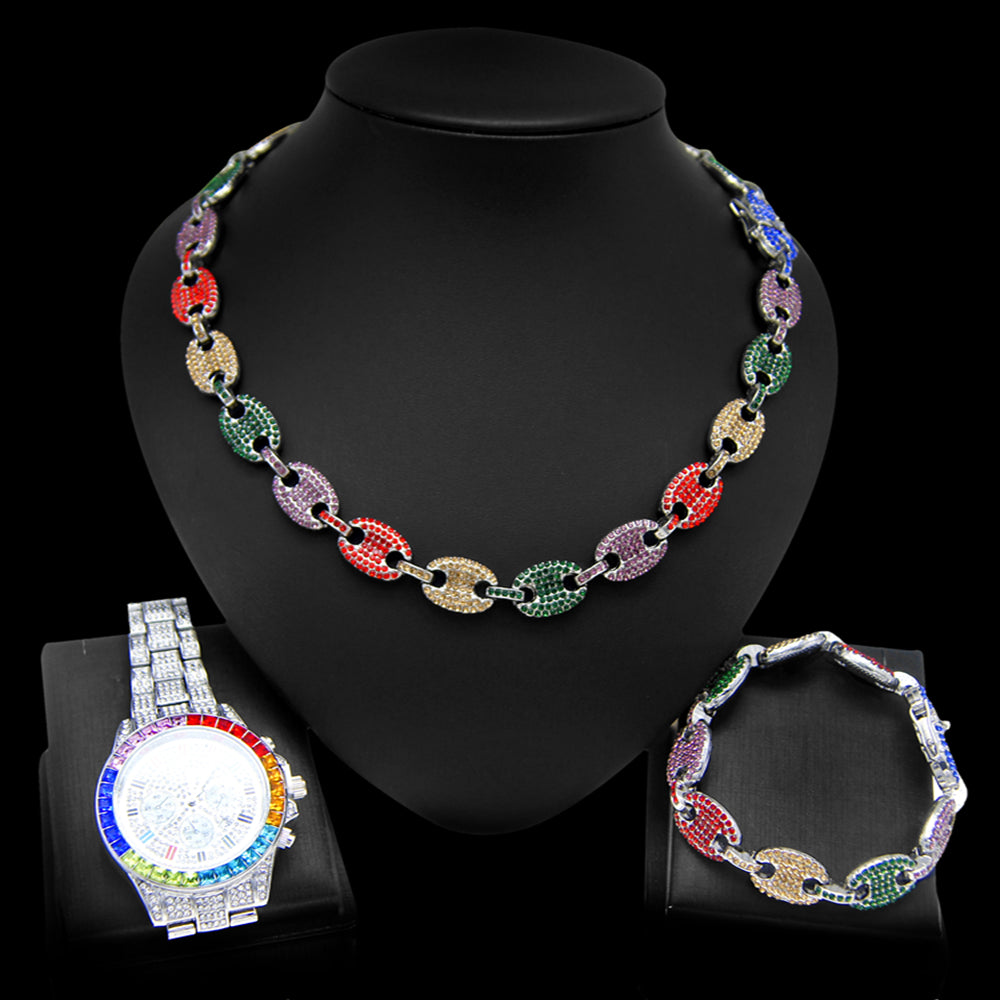 Hip hop set icedout puff mariner necklace bracelet colors stones watch Silver color gold Plated #206