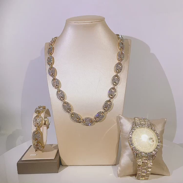 Iced out set puff mariner links necklace bracelet with hip hop watch Gold Plated #207