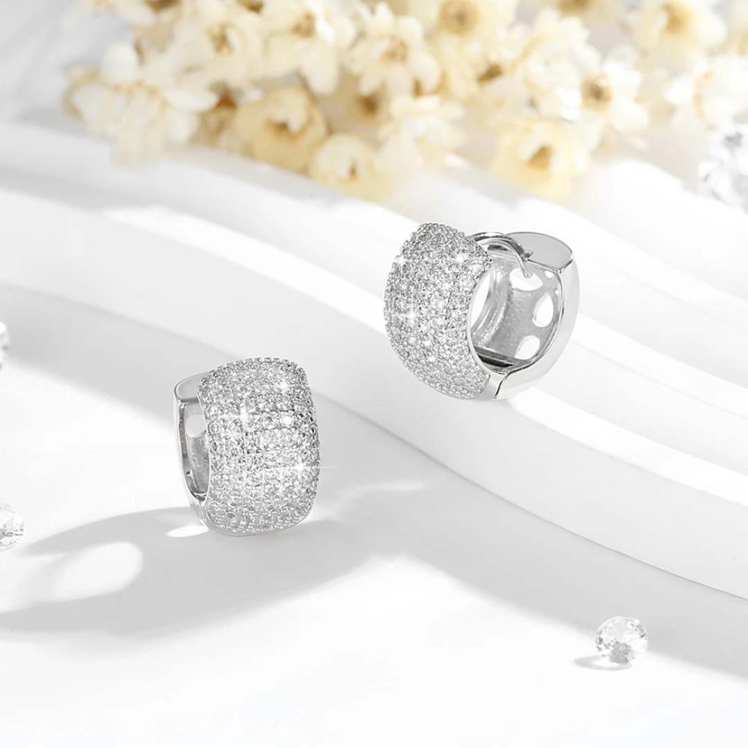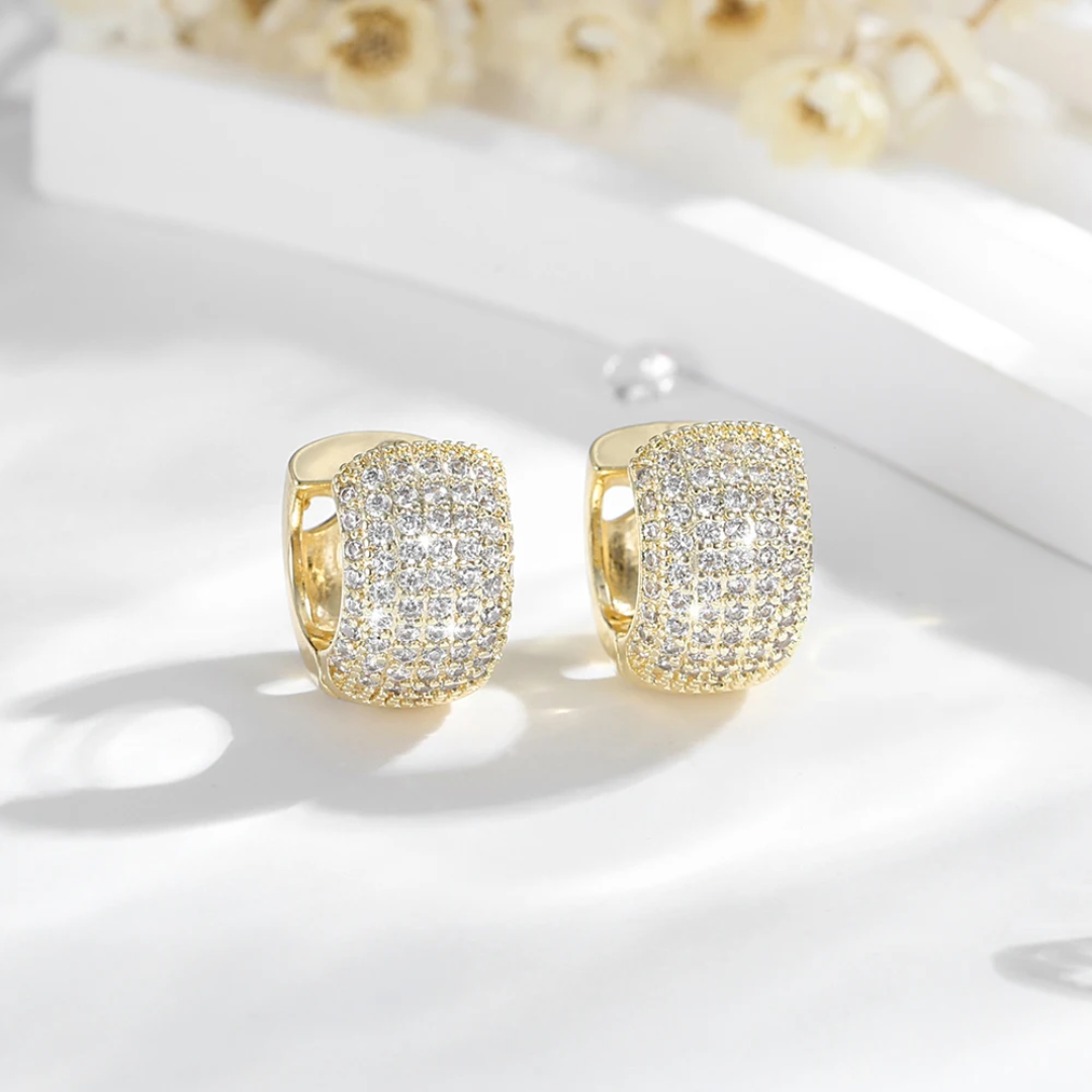 These 14k layered real gold plated iced-out huggies earrings feature round-shaped cubic zirconia stones in a pavé setting. The earrings are made of brass with a gold color and snap closure. The brand is .iced-out and the main stone color is white, adding to the beauty and elegance of the design. Imported from China, these earrings are a stylish and fashionable accessory for any jewelry lover looking to make a statement.